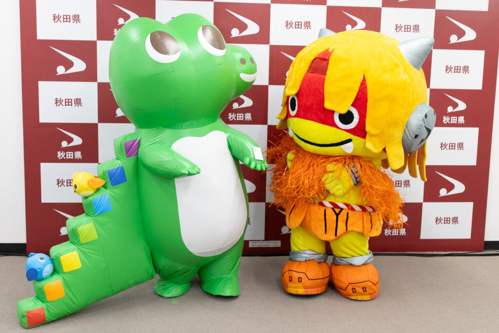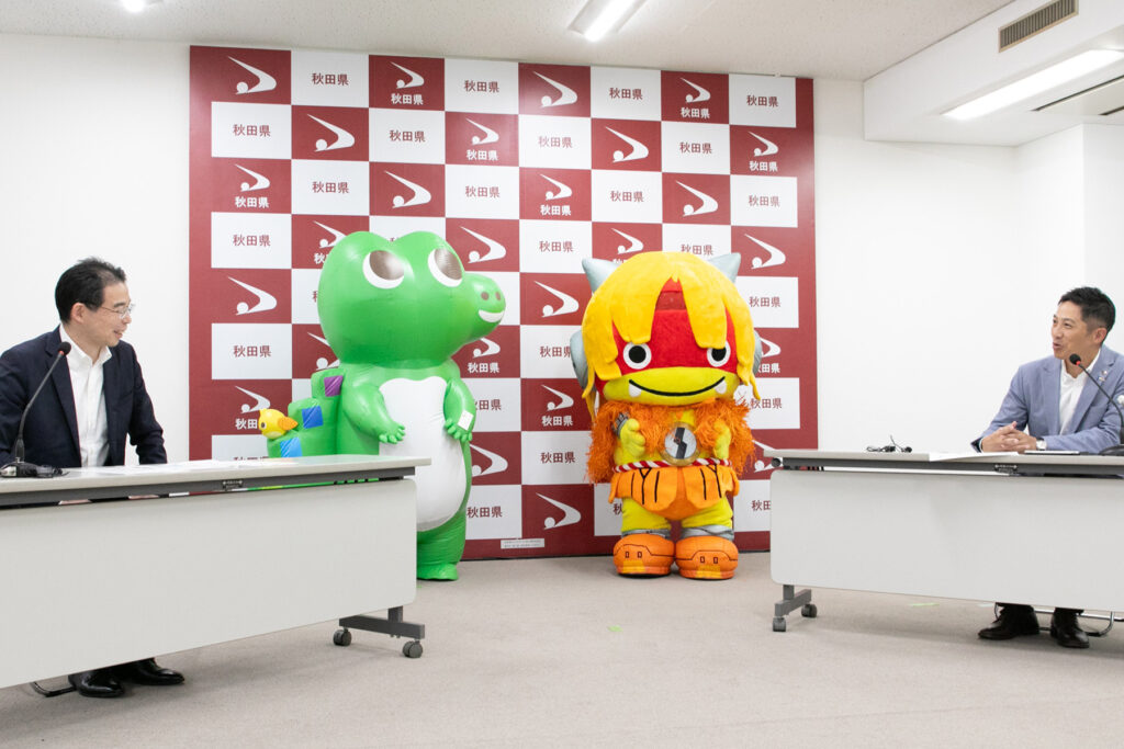 その後に行われたワニー参事官と、んだッチ(秋田県PRキャラクター)との撮影は、初対面とは思えないほど仲良くなり表敬訪問は終了しました。