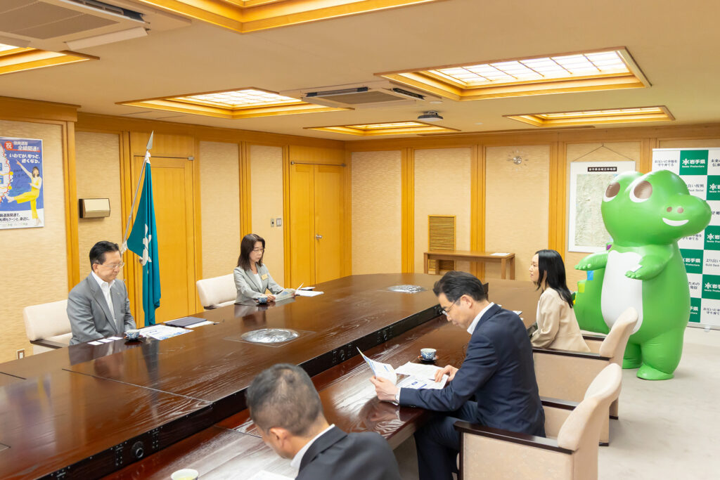 達増知事より「ワニー参事官、ようこそ岩手にお越しくださいました。金融経済教育を頑張っていきたいと思いますので、どうぞよろしくお願いいたします」という挨拶のもと、名刺交換がなされ、今後の連携への期待が感じられる一幕となりました。達増知事は、ワニー参事官の名刺に対し、「イラストが入っていてかわいらしいですね」と述べ、終始和やかな雰囲気の中で懇談が行われました。