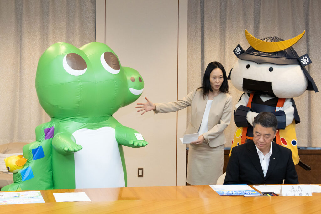 村井知事への表敬訪問を終えたワニー参事官は、むすび丸とも名刺交換し、むすび丸がワニーサの頭をなでる様子やハイタッチする様子もあり、仲睦まじく終了しました。