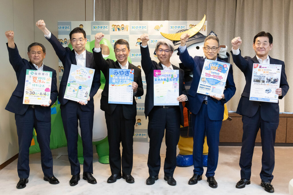 会見では、まず村井知事より宮城県金融広報委員会の夏休みイベントについて紹介がありました。知事からは「金融犯罪の防止を図る観点からも重要性が増しております金融経済教育について、会員である東北財務局、日本銀行仙台支店、株式会社七十七銀行、株式会社仙台銀行、東北労働金庫と協力しまして、『みやぎ夏の金融・経済教育盛り上げ隊!』を共同開催する」こととし、プログラムとして「お金との上手な付き合い方や社会の仕組み、銀行の役割を楽しく学ぶことができる企画をご用意しました」と説明しました。