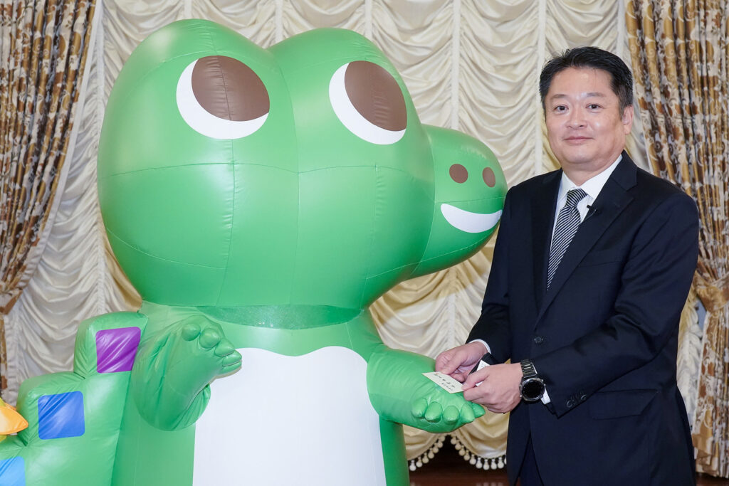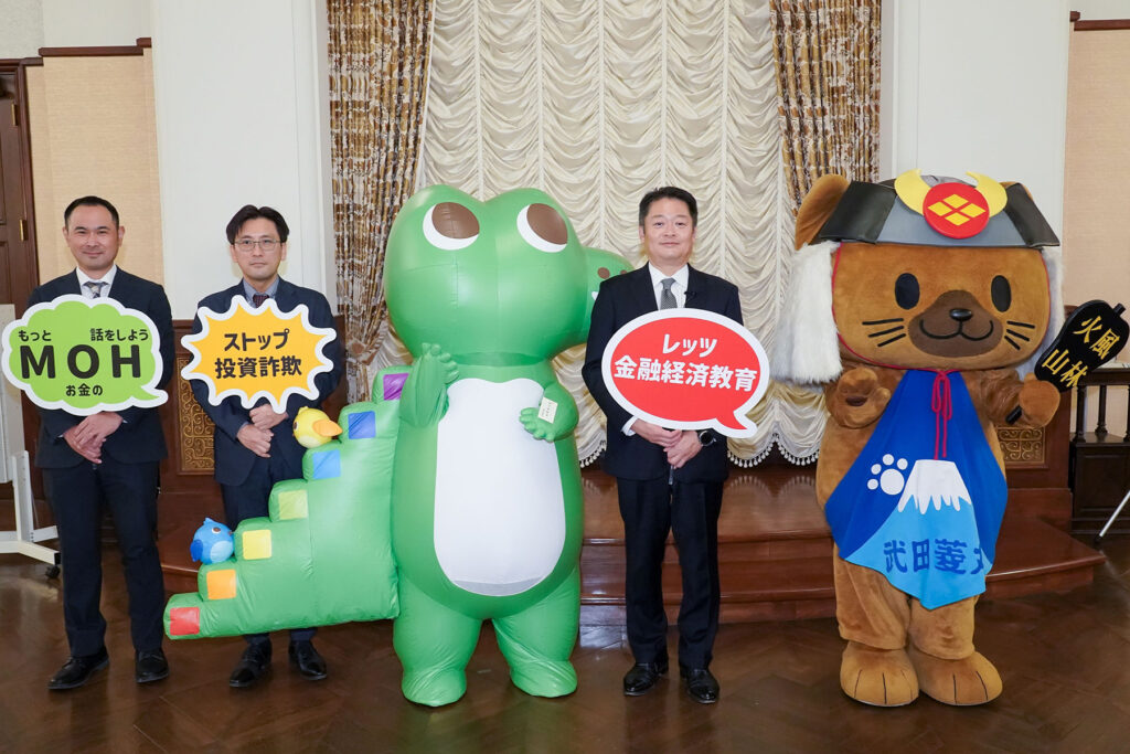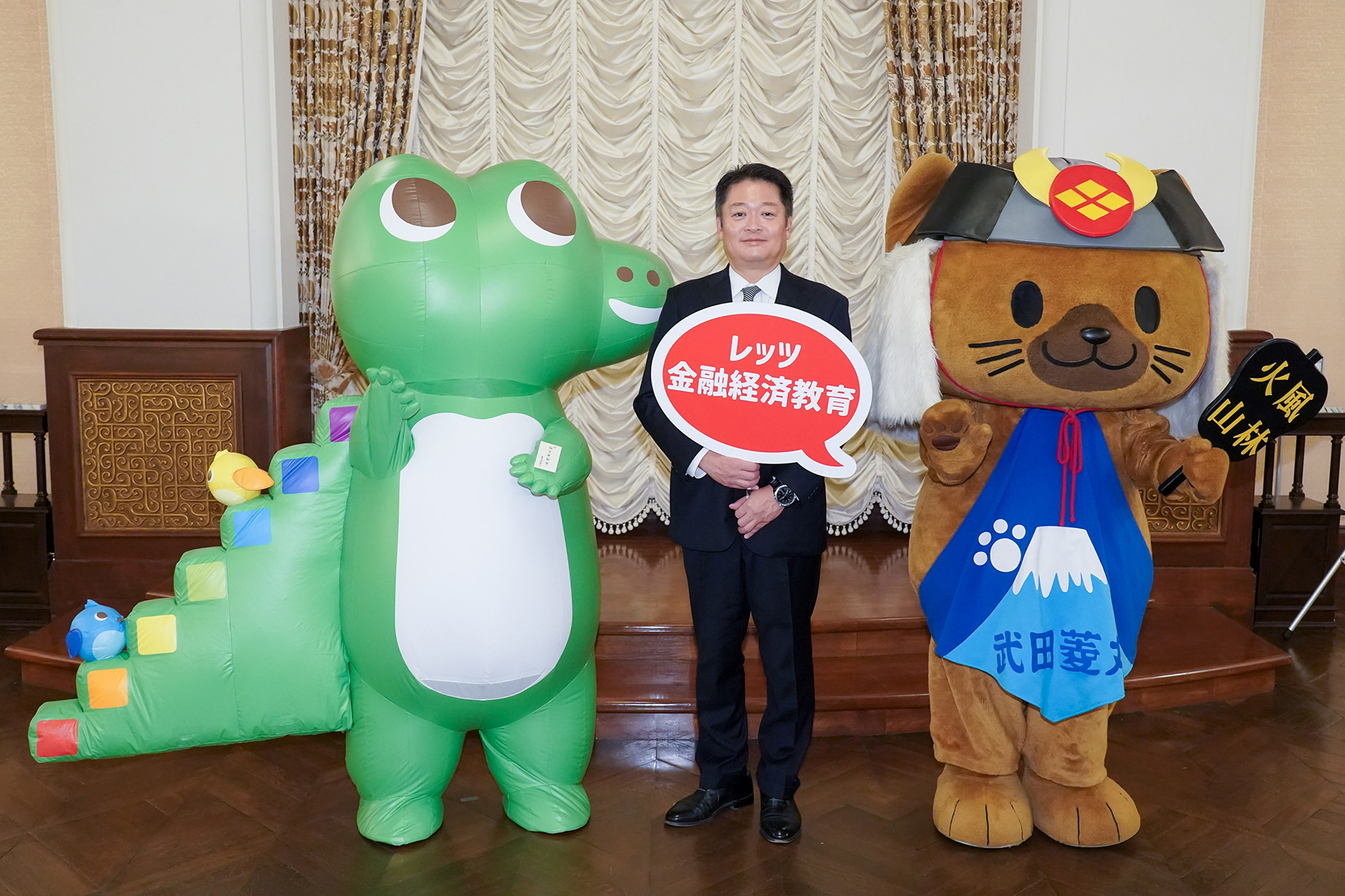 最後に、長崎知事とワニー参事官は名刺交換を実施。長崎知事の名刺をいただいたワニー参事官も元気に手を振り喜びを表現しました。武田菱丸も応援に加わり、山梨の金融経済教育がより一層盛り上がることを確信させる表敬訪問となりました。