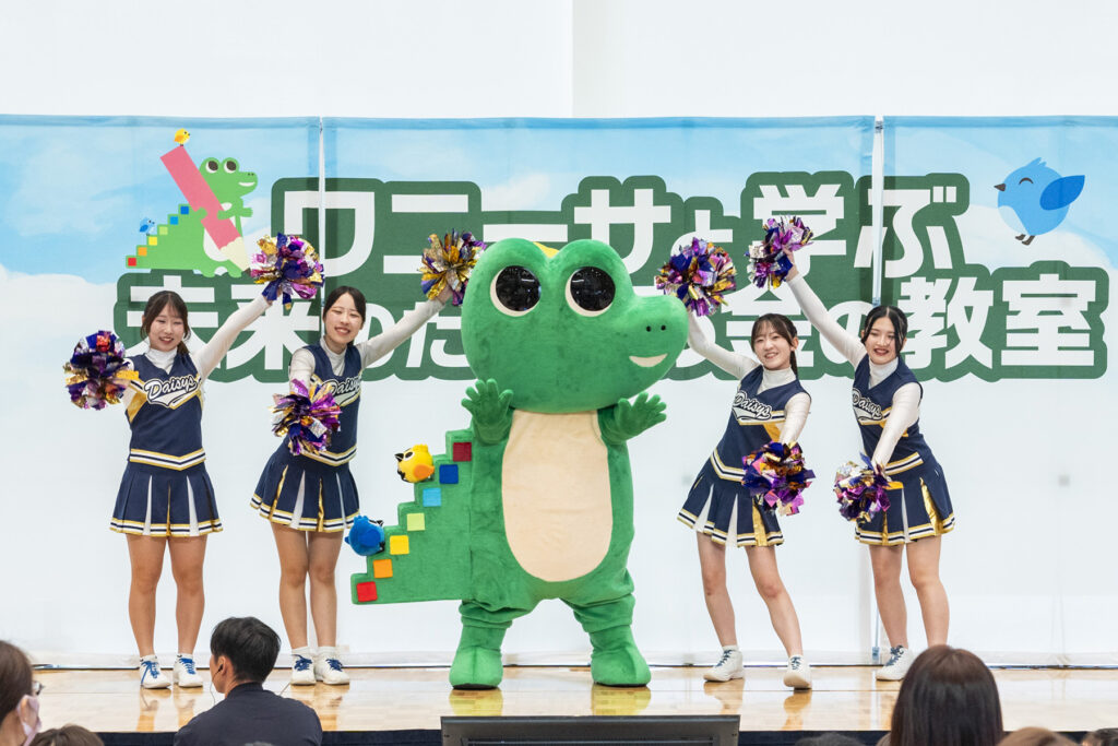 イベントは、東北学院大学チアリーディングチーム DAISYS(デイジーズ)がワニーサ応援団として登場し、ワニーサ出演のミュージックビデオに合わせたスペシャルパフォーマンスを披露することで華やかに幕を開けました。 会場はパフォーマンスの開始とともに大きな手拍子と熱気に包まれました。 MCの祇園も、機敏に踊るワニーサに衝撃を受けた様子でした。