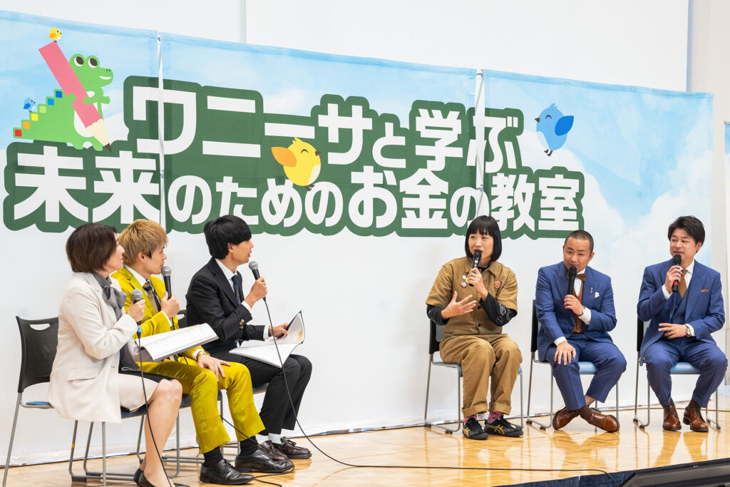 大人向けのトークショー「学ぼう!お金の知識 みんないっしょに幸せ家族」ではMC祇園、しずちゃん、メンバーに加え、J-FLEC認定アドバイザーの川口由美さんが登壇しました。